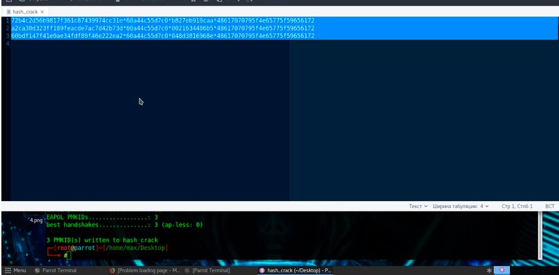 después de recibir el mensaje "ENCONTRADO PMKID", detenemos el script y, como puede observar, recibí de inmediato 3 mensajes sobre los paquetes encontrados que contenían una línea con un hash PMKID. Y así, Hcxdumptool hizo frente a su tarea y encontró el paquete correcto con un hash ... ¡adelante!