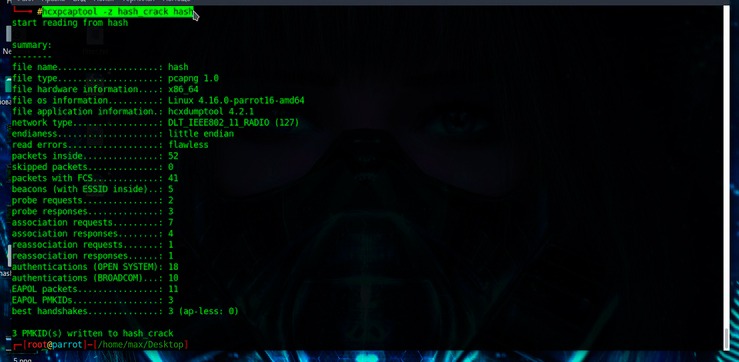 -z hash_crack: el archivo de salida, con el hash PMKID borrado de información innecesaria, para hashcat (hashmod -m 16800). convertido a texto plano.